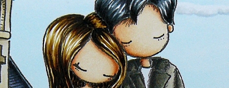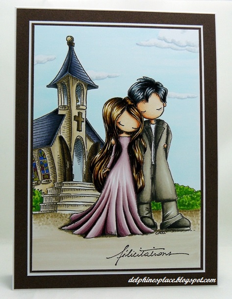 Pour cette scène, j’ai combiné deux images digitales dans Word – le couple est une image Tiddly Inks, You and Me, et l’église une image Make It Crafty, Wedding Church. J’ai ajouté un peu de buissons à droite avec un COPIC Multiliner, colorié le tout et j’ai terminé avec un sentiment Artemio.