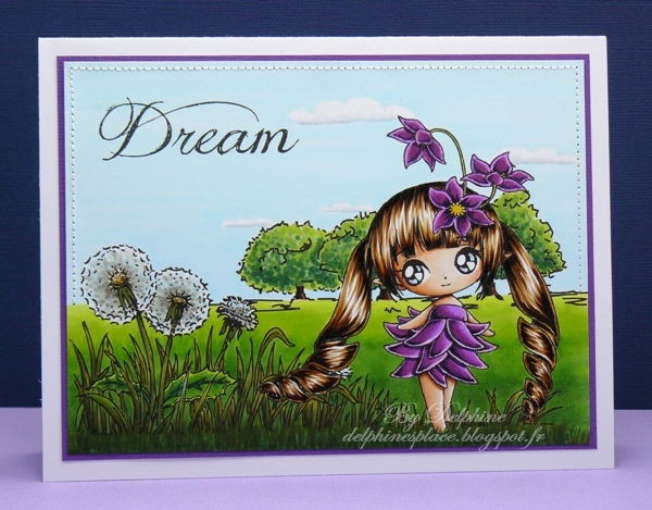 J’ai utilisé trois images digitales Make It Crafty que j’ai combinées dans Word: la petite Pipi, les pissenlits Dandelions et j’ai ajouté en fond des arbustes Shrubs, image que j’ai rognée pour ne garder des arbres qu’à droite de ma scène et laisser l’espace derrière les pissenlits libre pour pouvoir y placer un sentiment et ne pas trop charger la scène. J’ai tout colorié aux feutres COPIC, puis à l’aide d’une règle et d’un perce papier, j’ai percé un cadre autour de ma scène, que j’ai ensuite cousu à la main.