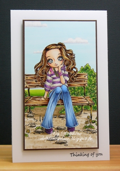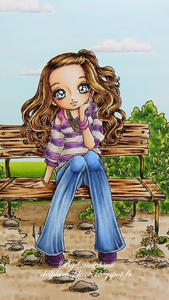 L’image que j’ai utilisée s’appelle Jacinta Sitting Thinking de Make It Crafty, je l’ai combinée au banc Make It Crafty Park Bench For Two dans Word pour faire une scène simple. Je l’ai coloriée avec mes feutres COPIC et j’ai essayé de donner un peu de texture au pantalon en recréant quelques plis.