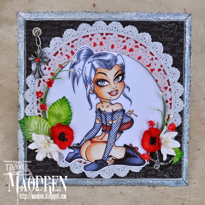 L’image que j’ai choisi aujourd’hui est un digistamp de Kenny K que vous pouvez trouver ici. Le fond de la carte est réalisé avec du papier noir tamponné à l’encre blanche sur lequel j’ai collé un napperon pour gâteaux doublé d’un fond rouge noirci sur le pourtour. Le digistamp est découpé en forme de cercle puis monté sur de la mousse 3D pour donner du relief. J’ai rajouté quelques fleurs et embellissements collés à la colle chaude.