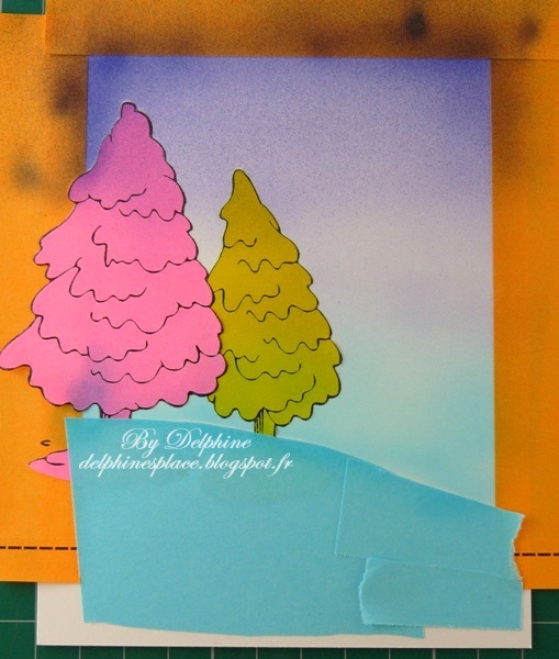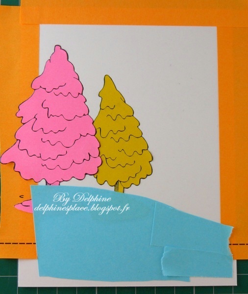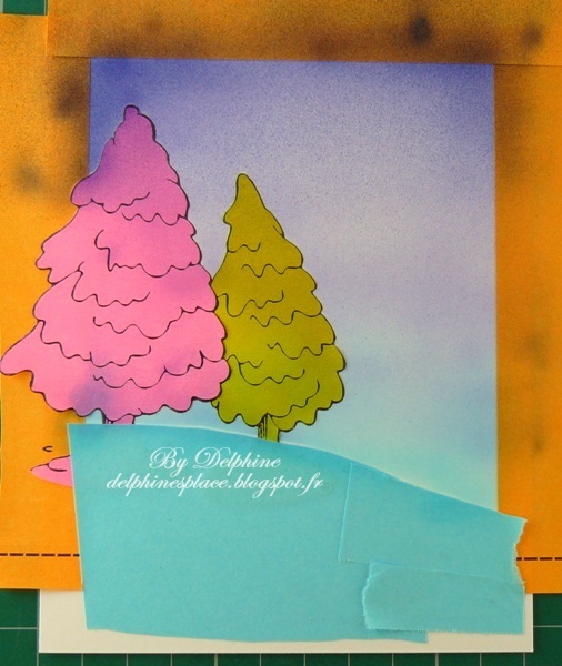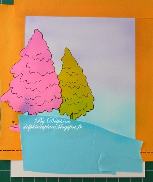 Tamponnez les éléments dont vous avez besoin pour votre scène, en commençant par tamponner ce qui doit être au premier plan. Pour masquer j’ai utilisé des Post It dont l’arrière est totalement adhésif, et de plusieurs couleurs pour vous montrer les différentes parties de la scène. Ici, j’ai tamponné le petit sapin en premier, je l’ai masqué puis j’ai ajouté des bandes (orange) autour de la scène pour conserver un cadre blanc. J’ai ensuite tamponné le sapin de gauche et je l’ai masqué (rose). Pour créer une petite pente, j’ai découpé un Post It bleu et couvert la zone pour ne pas avoir d’aérographe dessus.