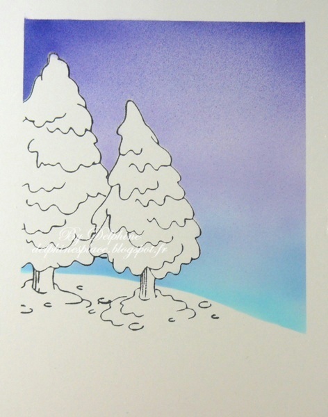 J’ai choisi de faire une scène hivernale simple avec juste un personnage et deux sapins – je n’ai pas tamponné et masqué le personnage pour cette scène car je voulais l’ajouter sur mousse 3D pour avoir un peu de relief, mais il est évidemment possible de l’inclure directement dans la scène!