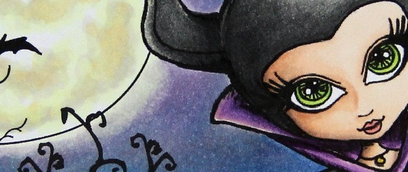 Pour cette scène, j’ai utilisé pour le fond une image digitale Make it Crafty qui s’appelle Spooky Curlz Garden et un personnage Tiddly Inks – Dark Queen, que j’ai combinés dans Word. J’ai colorisé toute la scène avec mes feutres Copic, et, une fois la scène finie, j’ai ajouté un peu d’encre Distress sur les bords. Pour finir, j’ai tamponné un sentiment Happy Halloween à l’encre Versamark, embossé avec de la poudre à embosser blanche Hero Arts.