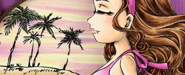 J’ai utilisé deux images digitales pour cette carte, le personnage Grace Dreaming et le décor The Beach, disponibles chez Make it Crafty. Le cadre est un chipboard Make it Crafty aussi – Delicate Ornate Circle Frame. Après avoir tout colorié au Copic (même le cadre, avec mon Copic E59), j’ai découpé la mer avec une découpe cercle Spellbinders de même diamètre que mon cadre et j’ai collé mon image au cadre. J’ai découpé Grace, que j’ai placée sur des carrés mousse pour avoir un peu de relief. Touche finale, un petit coeur recouvert de paillettes, chipboard Make it Crafty du set Outlined Words With Love (mais maintenant disponible par set de 50 coeurs – Mini Hearts Chipboard Tinklings).