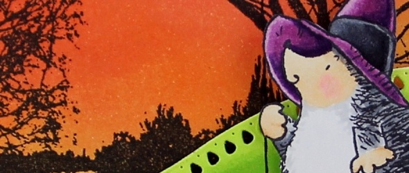 Le petit hérisson et son ballon viennent du set Bewitched. Je les ai découpés puis mis en couleur au COPIC. Pour la citrouille, Y17, YR04 et YR18… Pour le hérisson, j’ai utilisé du E50, 51, 53, RV02 pour la « peau », C1, 3, 5 pour les piquants, et C5, 7, 9, V01, 06, 09 pour le chapeau. J’ai utilisé une découpe Penny Black pour créer l’herbe, coloriée avec mes BG72, 75, 78, YG01, 03, 06, 09 et T7.