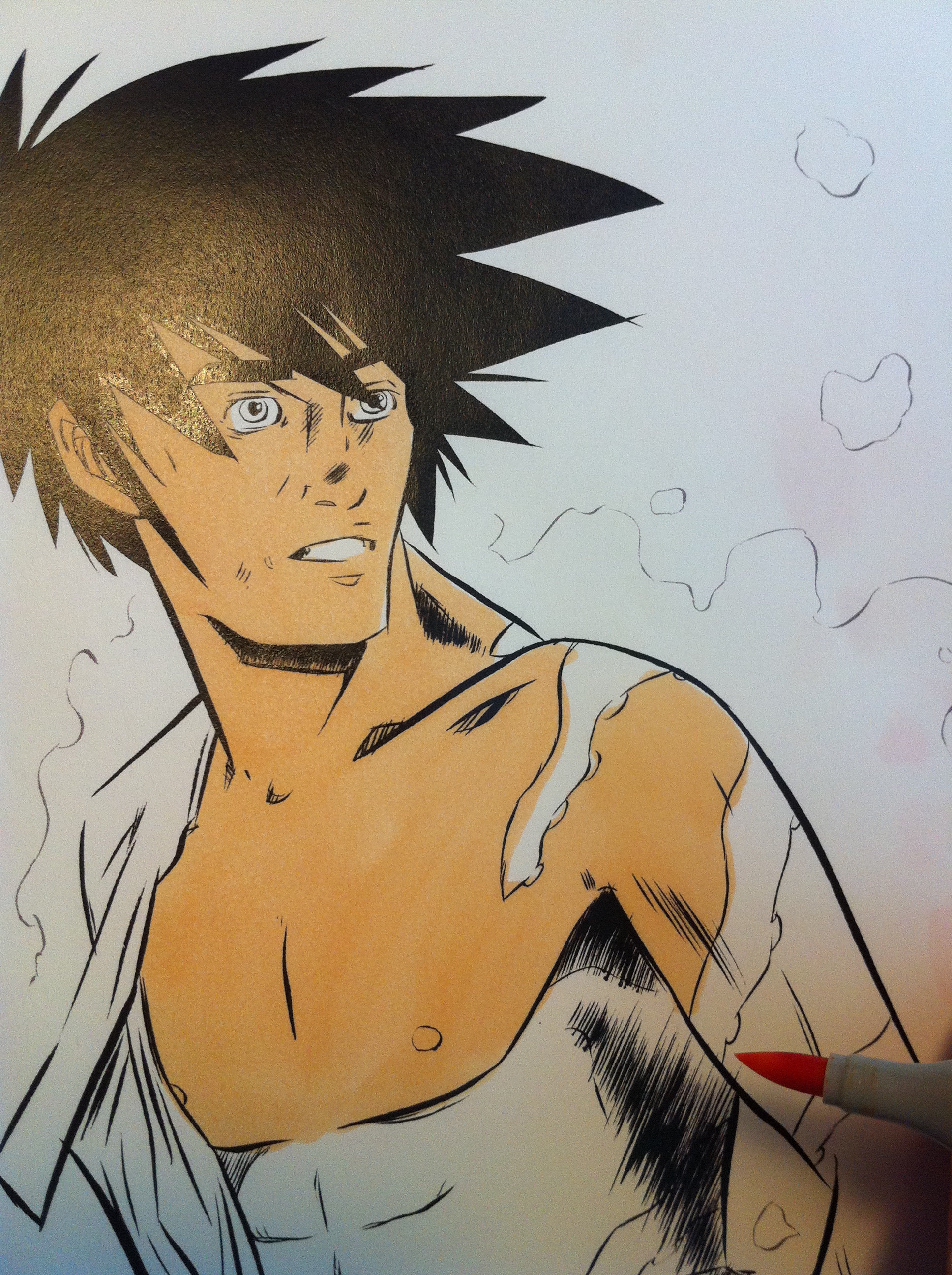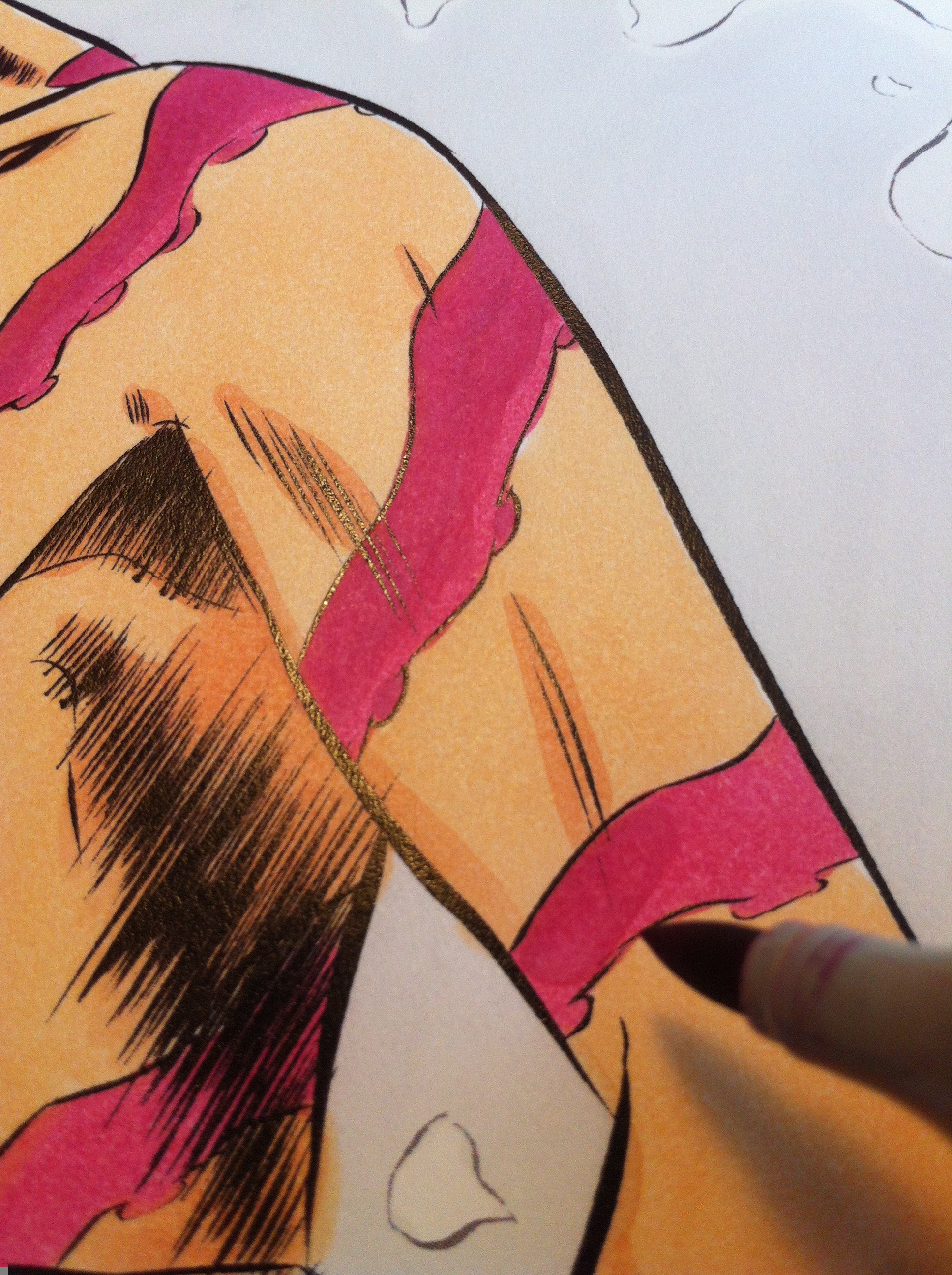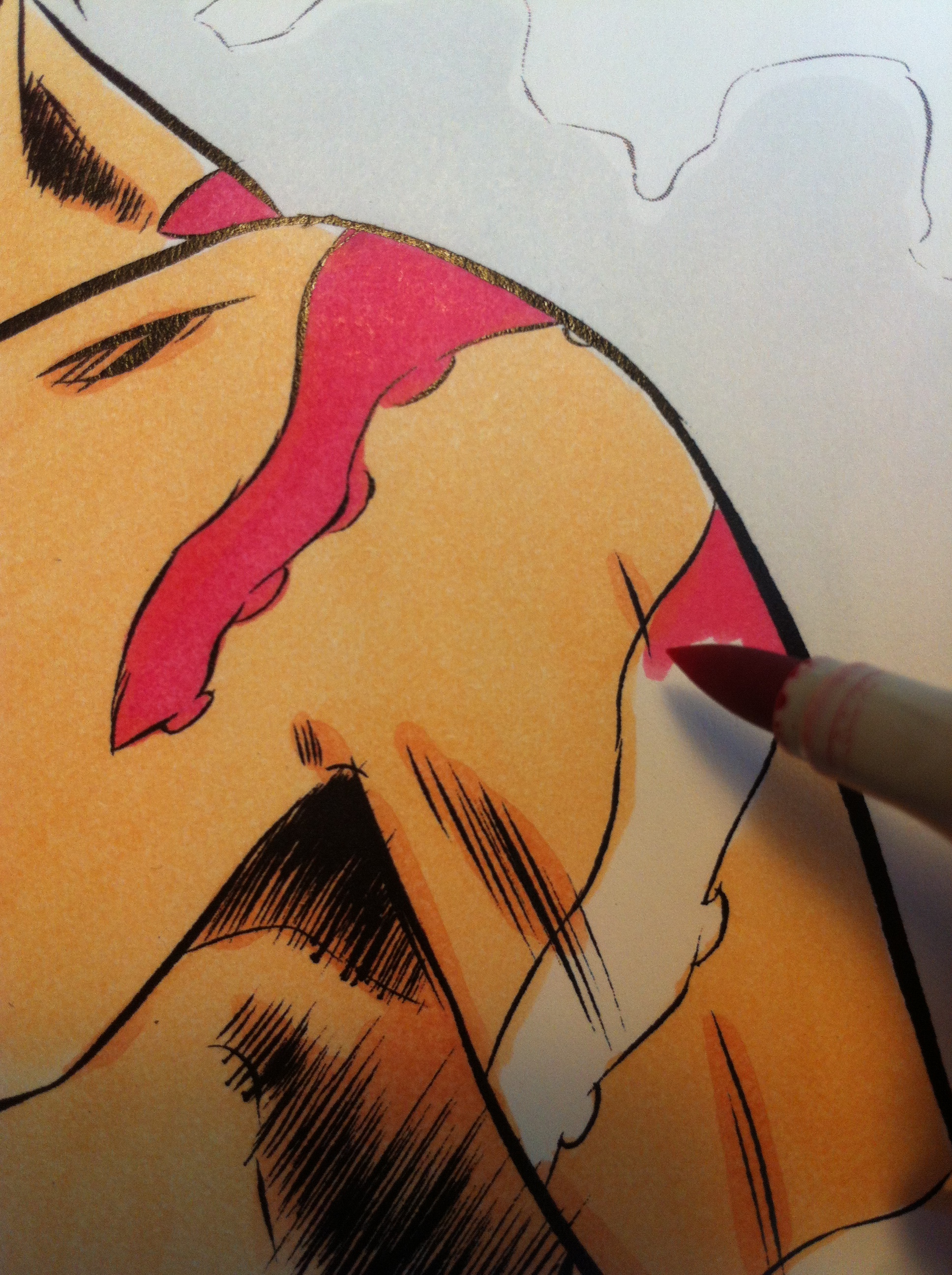 Première règle de base quand on commence une illustration au feutre : démarrer par les couleurs claires (ici, comme souvent, la peau). Ne jamais mettre en contact son feutre COPIC E21 Baby Skin Pink (qui me sert ici à faire la peau) avec, par exemple, un marron ou un rouge foncé déjà appliqué sur le dessin. Vous risqueriez de salir la mine du COPIC E21 et de gâcher de l’encre pour le nettoyer.