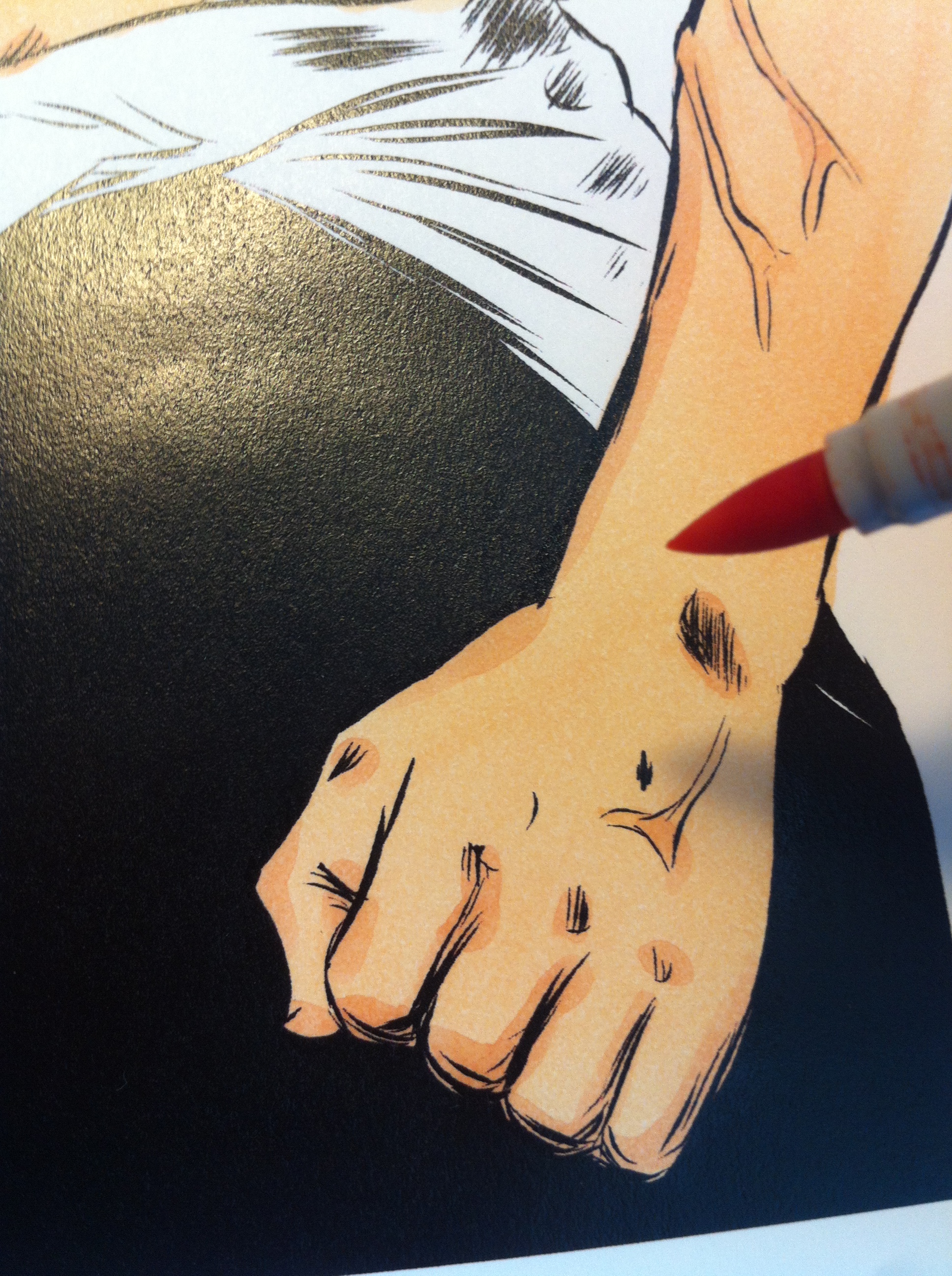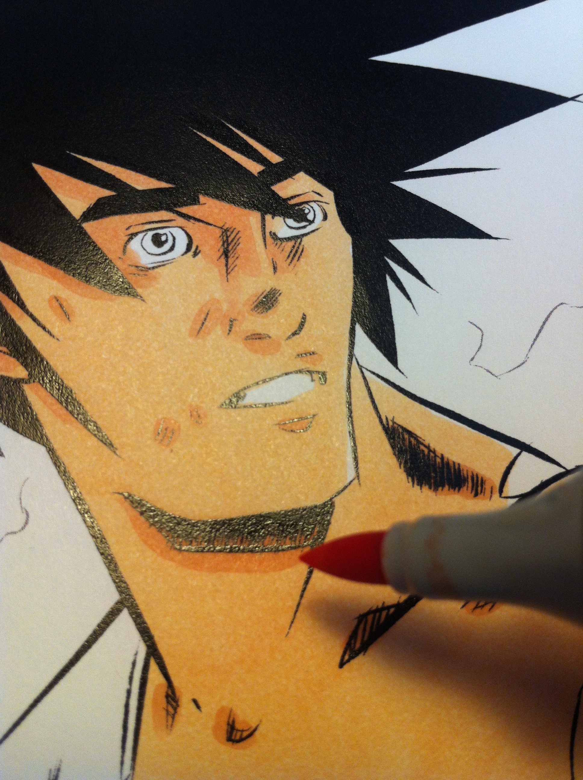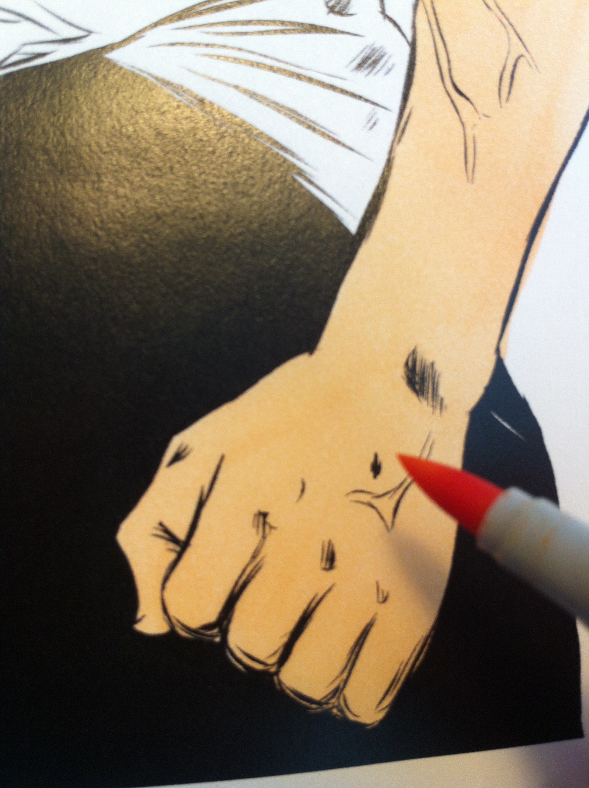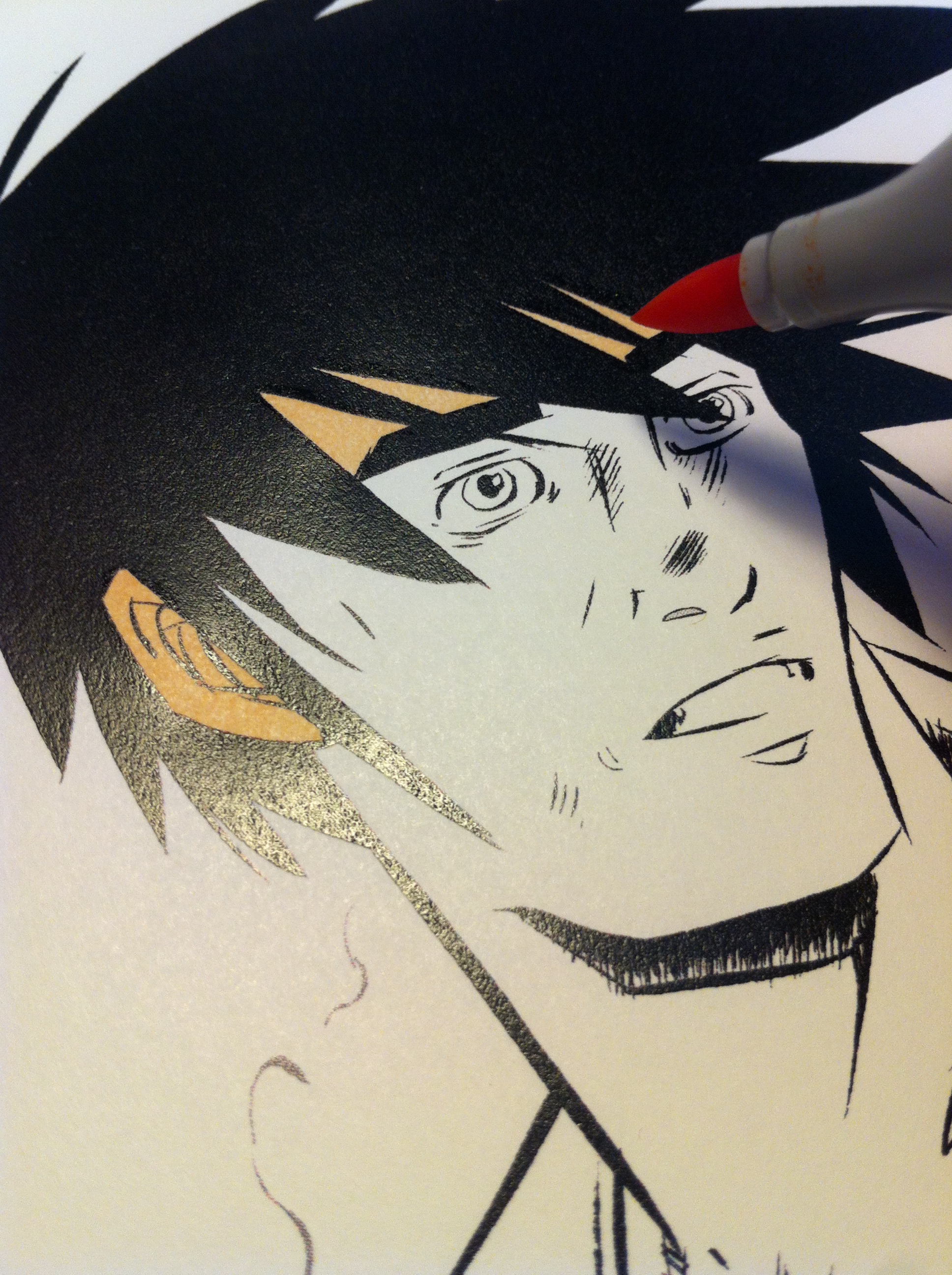 Première règle de base quand on commence une illustration au feutre : démarrer par les couleurs claires (ici, comme souvent, la peau). Ne jamais mettre en contact son feutre COPIC E21 Baby Skin Pink (qui me sert ici à faire la peau) avec, par exemple, un marron ou un rouge foncé déjà appliqué sur le dessin. Vous risqueriez de salir la mine du COPIC E21 et de gâcher de l’encre pour le nettoyer.