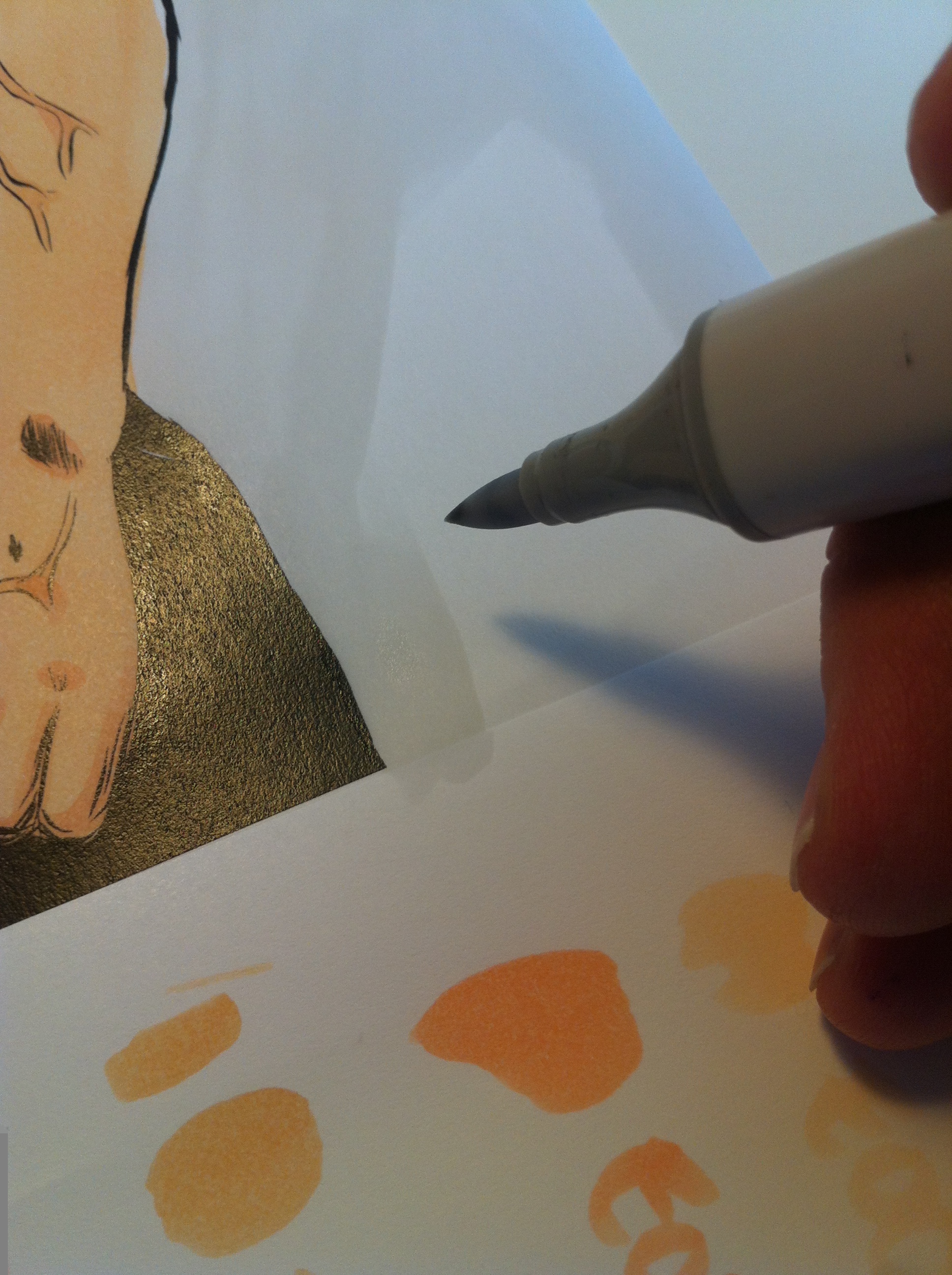 J’ai scanné puis imprimé l’illustration sur du Bleedproof Marker Pad COPIC, c’est plus sûr en cas d’erreur car certaines encres (même bien sèches) et feutres à alcool font rarement bon ménage.