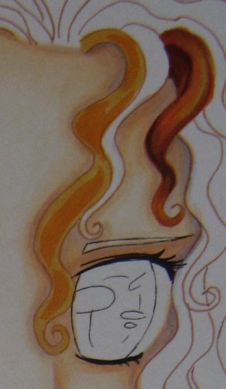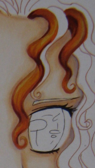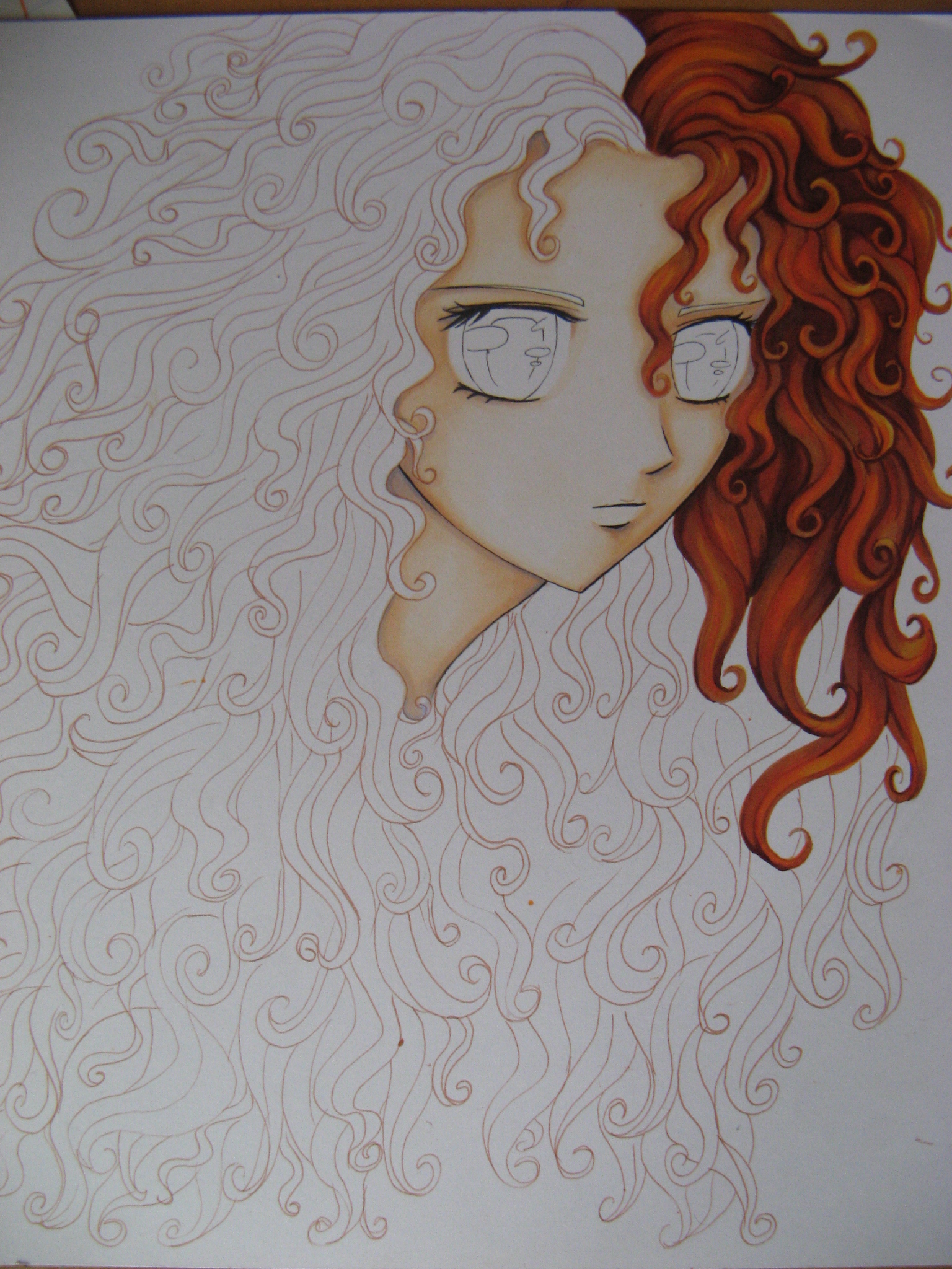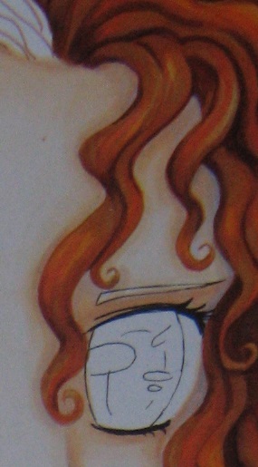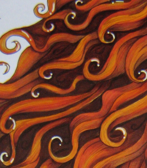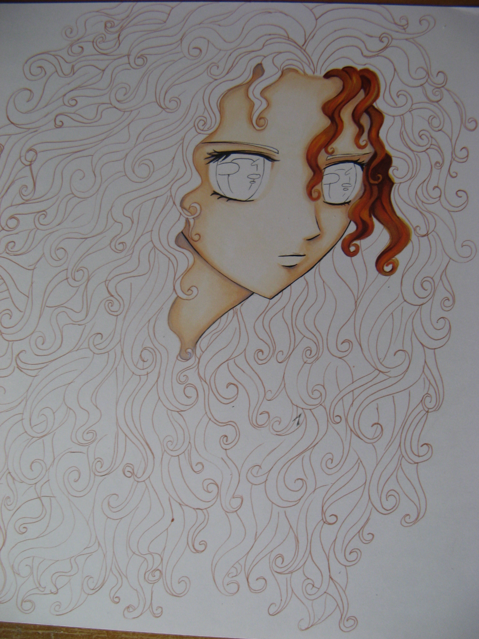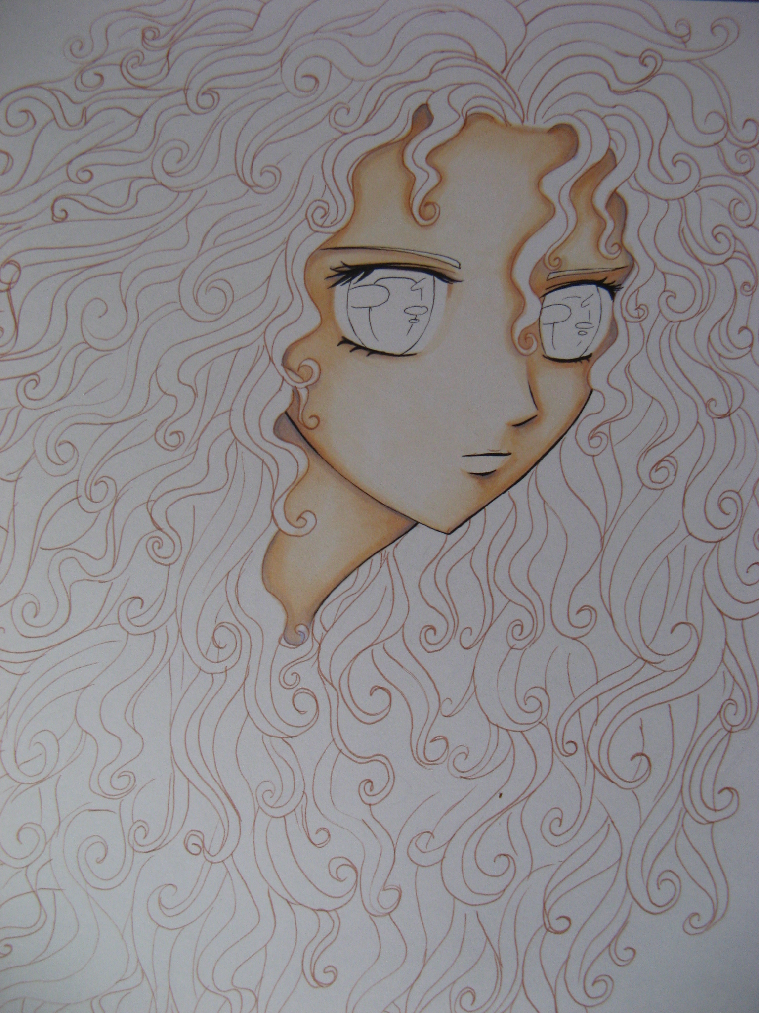 J’encre en noir ma mèche (après la colo c’est mieux, ça permet de prendre en compte les zones où j’ai dépassé!), avec mon stylo Copic Multiliner sépia (brun) j’ajoute un peu de texture en faisant des traits dans le sens de la longueur dans mes mèches en suivant bien la forme de la mèche.