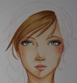 Je descends petit à petit sur le visage en partant du front et en coloriant de façon bien uniforme, sans trop me presser, le trait du pinceau toujours dans le même sens pour que le rendu de la couleur soit le plus homogène possible.