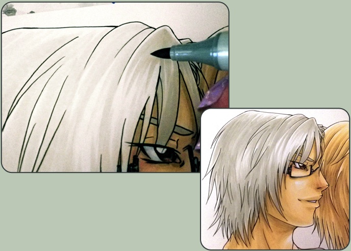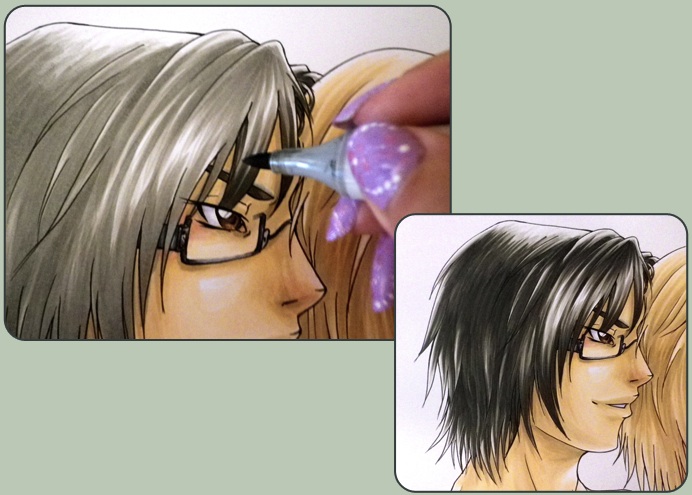 Pour certaines parties encore plus foncées comme l’arrière plan d’une boucle, j’utilise les COPIC E57 et E59 pour contraster encore les mèches et donner du volume.