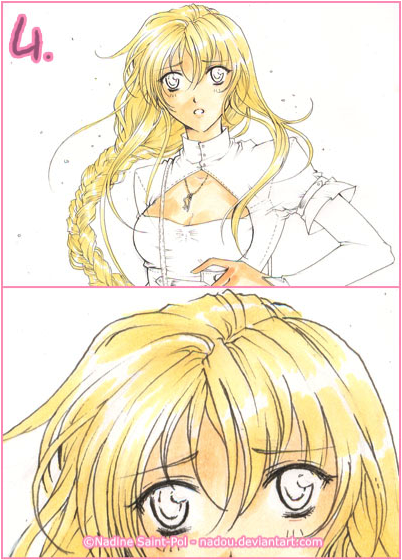 Ici dans l’ordre d’utilisation pour une mèche de cheveux : COPIC CIAO YR23, YR16, YR68, et E15.
