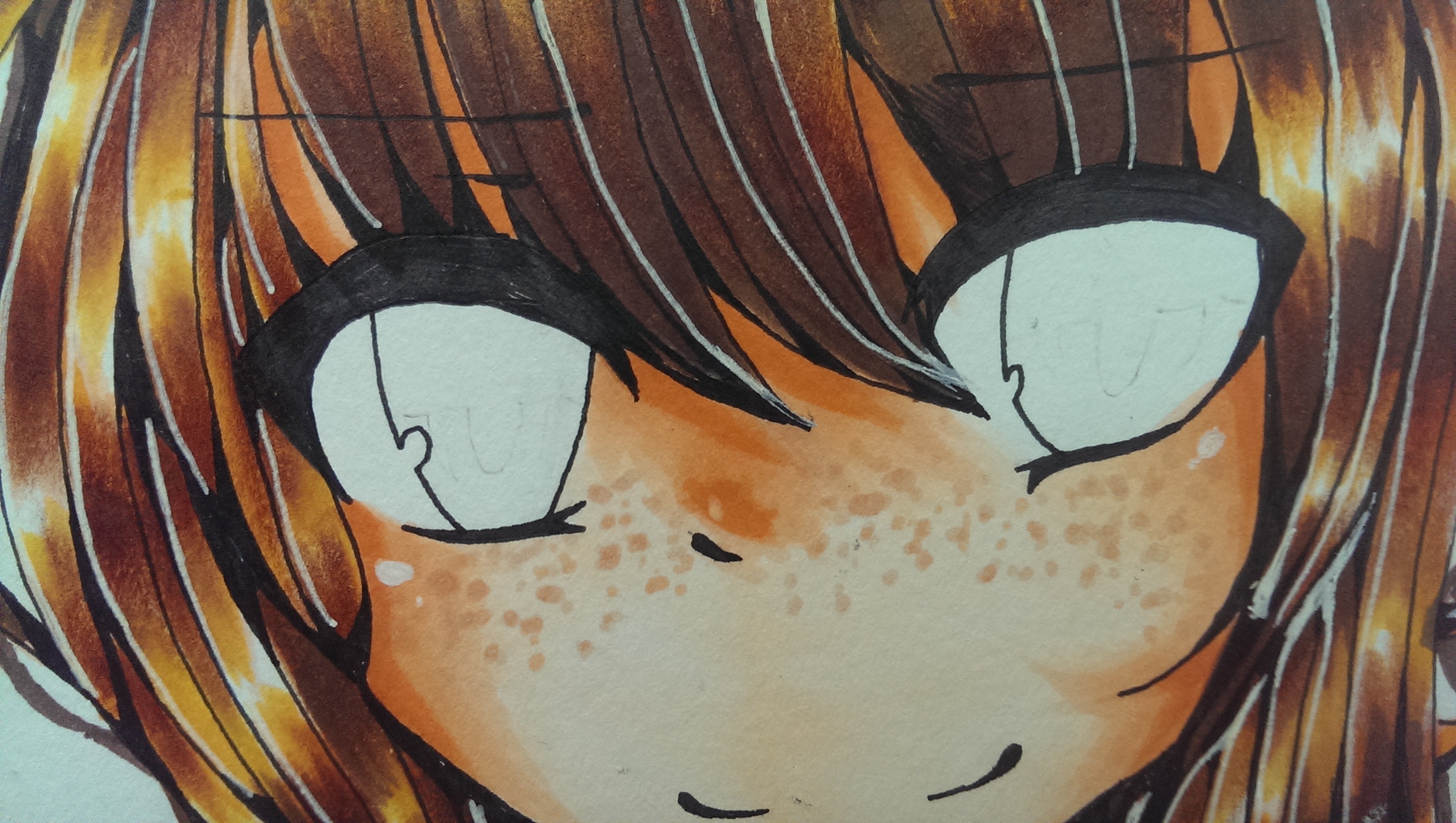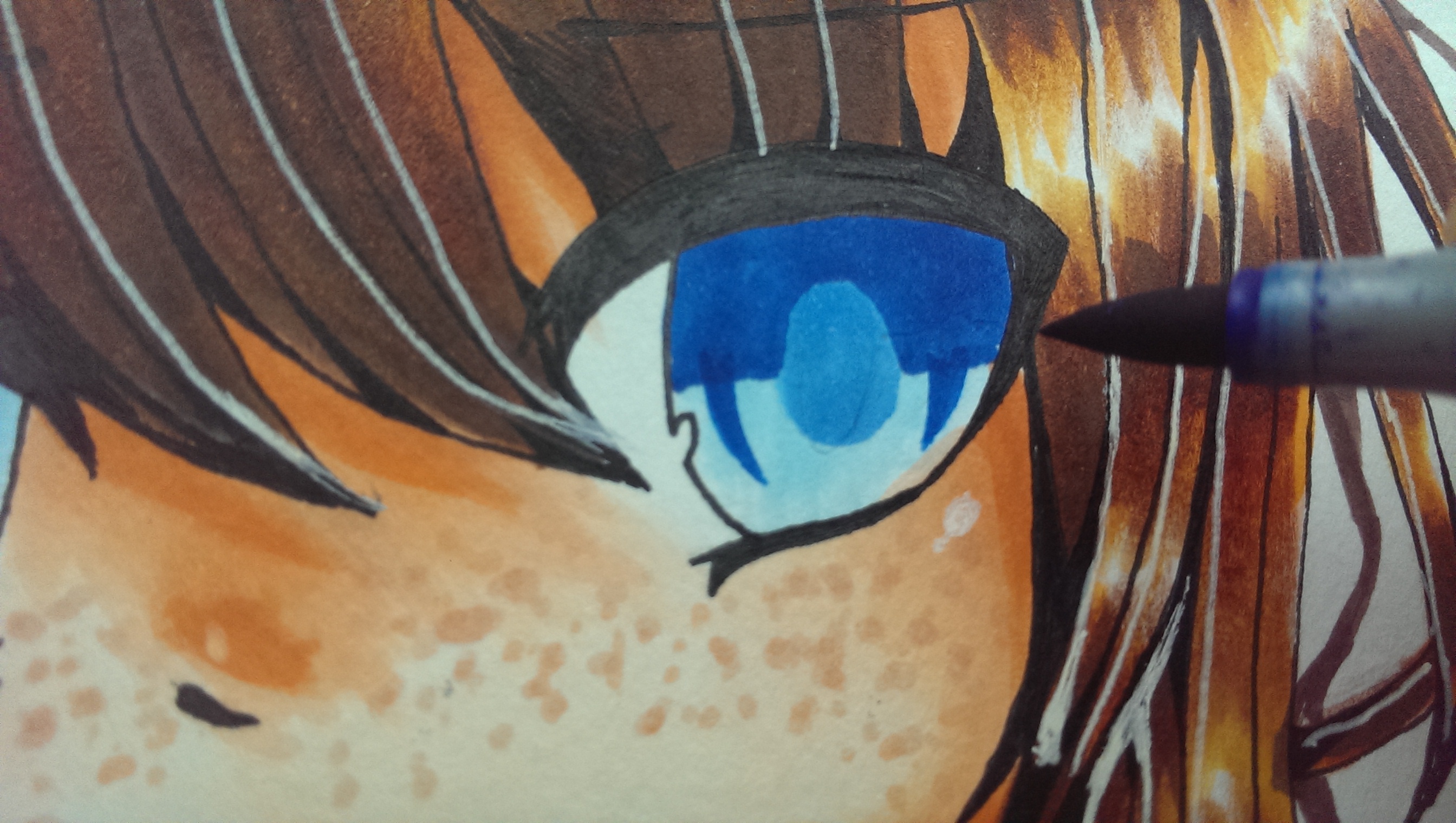 3. Prendre une couleur plus foncée (moi, le B18). Avec le feutre, tracez une ligne au milieu de l’oeil. Puis, coloriez la partie supérieure avec le même feutre (sans colorier la pupille).