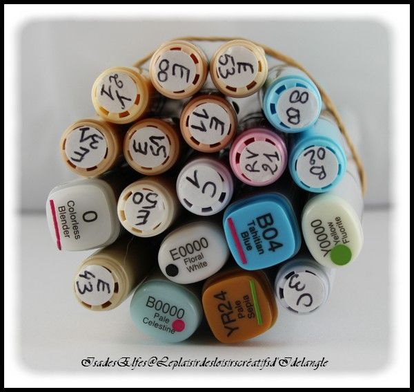J’utilise les Copic standard. Principalement avec la pointe biseautée. Je fais aussi des projections avec la pointe pinceau des Copic Sketch que je fais « rebondir » sur un CD. C’est très difficile à décrire, mais je remercie Sabine Rich pour la tuyau!